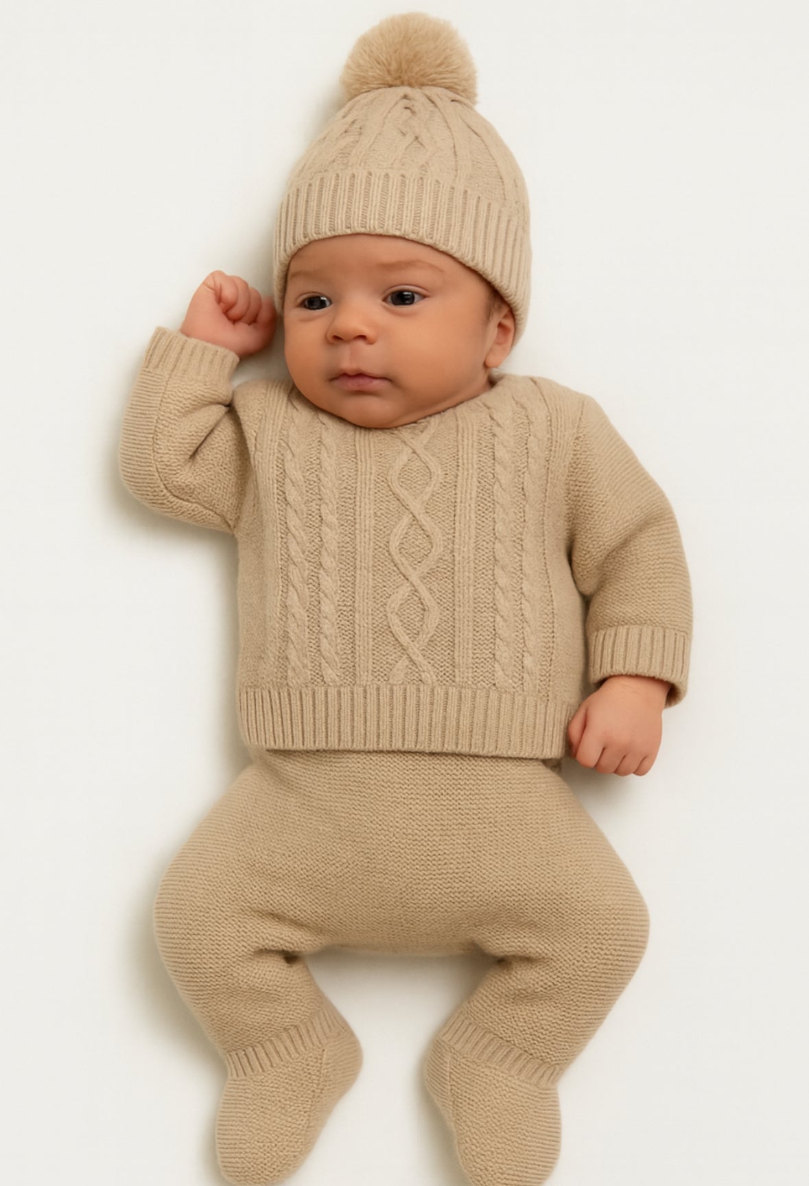 Baby Boys Cable Knitted Set with Pom-Pom Hat - Camel